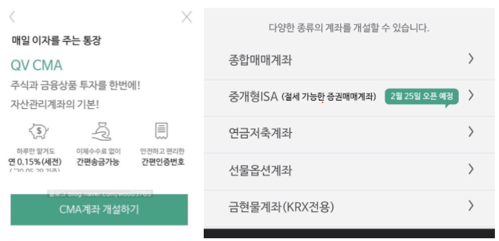 여러가지가 나오는데 그 안에서 CMA 계좌 터치! 그러면 위 화면이 나오고 개설 버튼이 나온다.